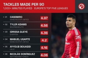 體育資訊3月19日訊 Squawka統(tǒng)計了本賽季球員在五大聯(lián)賽每90分鐘完成搶斷的次數(shù),并列出榜單,卡塞米羅4.97次居首,亞當(dāng)斯、蓋耶二三位。