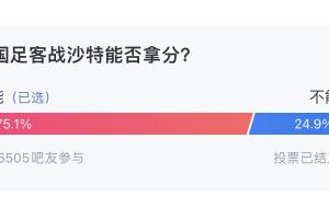 國足客戰(zhàn)沙特之前,75.1%的吧友認為國足能夠拿分,24.9%的吧友認為不能。最終國足0-1客場失利。