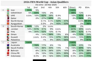 外媒Football Meets Data更新了世預(yù)賽亞洲區(qū)最新的晉級(jí)概率,其中國足以小組第二直接晉級(jí)世界杯的概率為2%,位列小組前四晉級(jí)附加賽的概率為29%,而直接淘汰的概率高達(dá)69%,但仍領(lǐng)先于印尼。