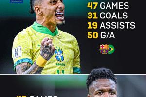 拉菲尼亞本賽季各項(xiàng)賽事數(shù)據(jù):47場(chǎng)31球19助,直接參與50球