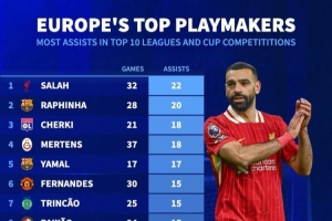 體育資訊3月21日訊 國(guó)家隊(duì)比賽周到來(lái),轉(zhuǎn)會(huì)市場(chǎng)也統(tǒng)計(jì)了本賽季歐洲前十聯(lián)賽俱樂(lè)部的球員助攻情況,薩拉赫壓拉菲尼亞居首。