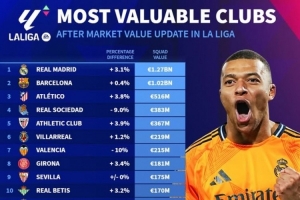 德轉(zhuǎn)更新西甲球隊身價榜:皇馬12.7億、巴薩10.2億、馬競5.16億