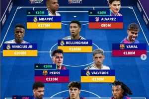 中場:維尼修斯(皇馬,2億)、佩德里(巴薩,1.2億)、貝林厄姆(皇馬,1.8億)、巴爾韋德(皇馬,1.3億)、亞馬爾(巴薩,1.8億)