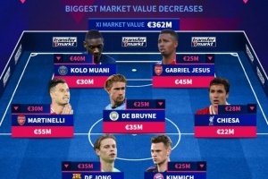 體育資訊1月1日訊 德轉列出了2024年身價下滑陣容,德布勞內、德容、基米希、熱蘇斯、穆阿尼在列。
