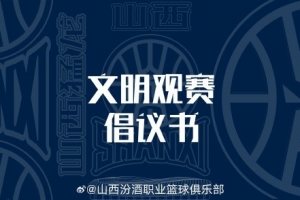 CBA聯(lián)賽不僅是一項(xiàng)國(guó)內(nèi)頂級(jí)體育賽事,更是展示城市形象、提升城市美譽(yù)度、擴(kuò)大籃球文化影響力的重要平臺(tái)。作為山西汾酒男籃的忠實(shí)支持者,每一位球迷的言行都代表著山西的形象。因此,山西汾酒職業(yè)籃球俱樂(lè)部在此向所有熱愛(ài)籃球、熱愛(ài)CBA聯(lián)賽、熱愛(ài)山西汾酒男籃的朋友們發(fā)出如下倡議: