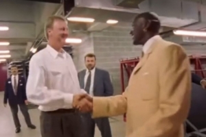 本場比賽,巴特勒在被交易后首次迎戰(zhàn)老東家熱火。賽前,樂福在INS轉(zhuǎn)發(fā)了邁克爾-喬丹與拉里-伯德打招呼的視頻,并寫道:“當(dāng)吉米在今晚的比賽中看到我時(shí)就是這樣的?!?/p>