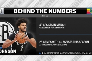 轉(zhuǎn)播方曬出一組數(shù)據(jù),籃網(wǎng)球員卡梅隆-約翰遜在3月已送出49次助攻、場(chǎng)均4.5次,這2項(xiàng)數(shù)據(jù)是他個(gè)人生涯的單月新高。