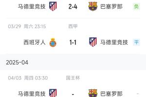 之后馬競的下一場比賽,又正是國王杯的半決賽,他們將對陣巴薩。首回合兩隊4-4戰(zhàn)平,上個月西甲馬競2-4告負。