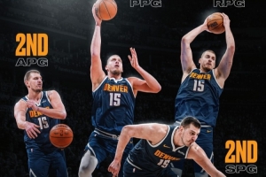約基奇本賽季目前的場(chǎng)均得分、籃板、助攻、搶斷均排名聯(lián)盟前3: