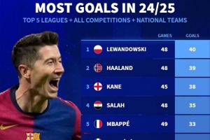 體育資訊3月31日訊 德國轉(zhuǎn)會市場統(tǒng)計了本賽季五大聯(lián)賽球員所有賽事的進(jìn)球數(shù)量,并列出榜單,36歲萊萬以40球居首,哈蘭德、凱恩排名二三位。