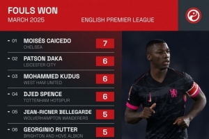 體育資訊4月1日訊 Squawka統(tǒng)計(jì)了英超3月份球員制造犯規(guī)的次數(shù),并列出榜單,凱塞多7次居首。
