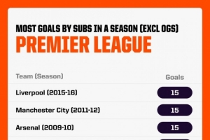 英超歷史單賽季替補進球排名:
