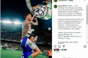 安東尼在社交媒體上曬出赤膊揮舞隊旗慶祝的照片,配文:“周日不僅僅是一場比賽……它展現(xiàn)了貝蒂斯的真正意義。在貝尼托-比利亞馬林球場上演了一場歷史性的德比逆轉(zhuǎn),全場球迷的熱情燃爆了!”