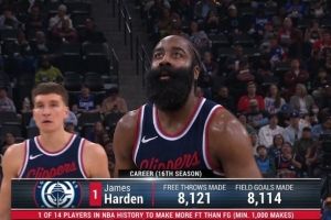 快船后衛(wèi)哈登罰球命中數(shù)8212個,而他的運動戰(zhàn)進球數(shù)有8114個。