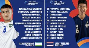 烏茲別克斯坦U17替補:1-紹基羅夫、5-穆拉多夫、6-阿布杜卡里莫夫、8-穆哈馬多夫、10-哈比布拉耶夫、12-伊茲博斯卡諾夫、13-法茲里迪諾夫、16-阿布杜穆米諾夫、17-魯斯塔莫夫、20-阿利耶夫、22-阿布杜拉耶夫、23-馬克穆德佐諾夫