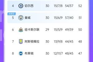 英超爭五:第4切爾西52分、第5曼城51分、第6紐卡少賽一輪50分、第7阿斯頓維拉48分、第8布萊頓47分……