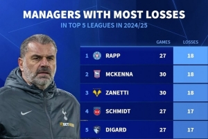 本賽季五大聯(lián)賽教練失利場(chǎng)次排名(僅統(tǒng)計(jì)聯(lián)賽):