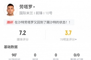 數(shù)據(jù)方面,勞塔羅全場(chǎng)8次射門,3次射正,2次失良機(jī)!2次關(guān)鍵傳球,11次地面對(duì)抗7次成功,1次空中對(duì)抗1次成功;防守方面另有2解圍、1攔截、1搶斷,評(píng)分7.2分。