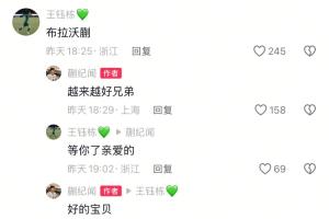 王鈺棟在評論區(qū)留言:“布拉沃蒯?!必峒o(jì)聞回復(fù):“越來越好兄弟。”王鈺棟:“等你了親愛的?!必峒o(jì)聞:“好的寶貝?!?/p>