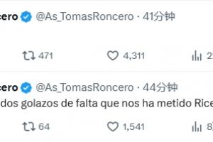 賴(lài)斯任意球雙響時(shí),龍賽羅發(fā)文:“賴(lài)斯在對(duì)陣我們時(shí)踢進(jìn)兩個(gè)令人難以置信的精彩任意球。太糟糕了?!?/p>