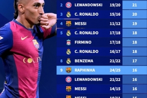 本賽季巴薩邊鋒拉菲尼亞在各項(xiàng)賽事中表現(xiàn)相當(dāng)出色,其中歐冠中他在出場(chǎng)10次打進(jìn)11球貢獻(xiàn)5次,直接參與進(jìn)球16個(gè)。拉菲尼亞能否打破由C羅保持的22個(gè)歐冠聯(lián)賽單賽季直接參與進(jìn)球紀(jì)錄紀(jì)錄?