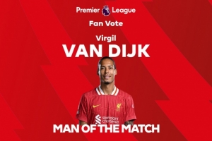 本場比賽范迪克打進(jìn)制勝進(jìn)球,賽后他也當(dāng)選英超官方球迷票選出的本場最佳球員。