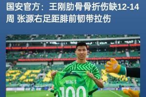 1個月前,國安曾發(fā)布傷情公告稱,王剛在熱身賽中肋骨骨折,預(yù)計恢復(fù)周期12-14周。