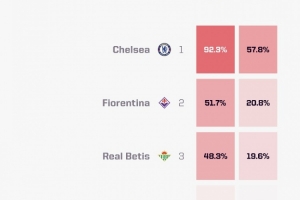 體育資訊4月18日訊 歐協(xié)聯(lián)1/4決賽戰(zhàn)罷,切爾西、佛羅倫薩、貝蒂斯、尤爾加登晉級(jí)四強(qiáng)。Opta超級(jí)計(jì)算機(jī)預(yù)測(cè)了各隊(duì)奪冠的概率,切爾西57.8%居首。