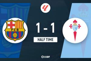 上半場傷停補(bǔ)時2分鐘,半場結(jié)束,巴薩暫1-1塞爾塔。
