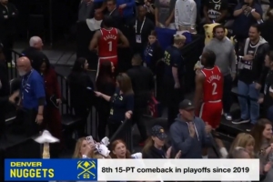 掘金今天最多落后快船15分,但逆轉(zhuǎn)加時(shí)取勝,現(xiàn)場給出統(tǒng)計(jì),這是2019年以來掘金第八次是季后賽完成落后15+的逆轉(zhuǎn)!