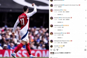 本場比賽馬丁內(nèi)利取得進球,這也是他槍手生涯各項賽事第50粒進球。賽后他在個人社媒曬出本場照片,配文寫道:“打進為阿森納效力第50球,無比自豪!”
