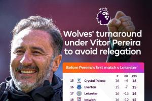 2024年12月,狼隊(duì)宣布由佩雷拉接管狼隊(duì)主帥的位置。佩雷拉上任后,帶隊(duì)取得11勝2平7負(fù)的成績,狼隊(duì)從落后保級(jí)區(qū)5分到如今領(lǐng)先17分提前完成保級(jí),實(shí)現(xiàn)了驚人的逆襲。