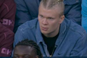 體育資訊04月23日訊 曼城vs維拉,上半場(chǎng)轉(zhuǎn)播鏡頭給到看臺(tái)上的哈蘭德!魔人換人新發(fā)型!